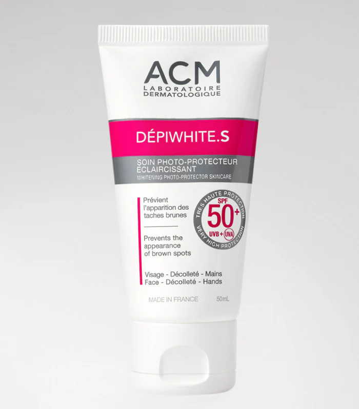 ACM Depiwhite S SPF50+ est un soin solaire quotidien destiné aux peaux sujettes aux taches brunes. Il associe une très haute protection UVA/UVB (SPF50+) à des agents dépigmentants pour prévenir et limiter l’apparition des taches liées au soleil. Sa texture légère, fluide et non grasse s’applique facilement et convient à une utilisation quotidienne, même sous le maquillage. Non comédogène, sans parfum, il respecte les peaux sensibles. C’est un allié essentiel dans toute routine anti-taches, surtout en période d’exposition solaire. Disponible à Casablanca, livraison partout au Maroc et retrait possible en parapharmacie.