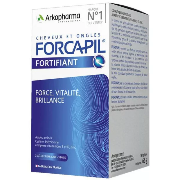 FORCAPIL 180 gélules est un complément alimentaire renforçant la vitalité, la croissance et la résistance des cheveux et des ongles. Cure complète de 3 mois.