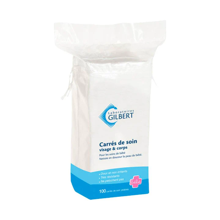 Les Carrés de Soin GILBERT 100 unités sont des compresses en coton non tissé, spécialement conçues pour la toilette quotidienne des bébés. Doux, résistants et très absorbants, ils sont parfaits pour nettoyer le visage, le corps ou la zone du siège, en particulier avec du liniment ou de l’eau. Leur texture ne peluche pas et respecte la peau délicate des tout-petits. Adaptés aussi à un usage médical ou cosmétique. Format économique. Disponible à Casablanca, livrable partout au Maroc avec retrait possible en parapharmacie.