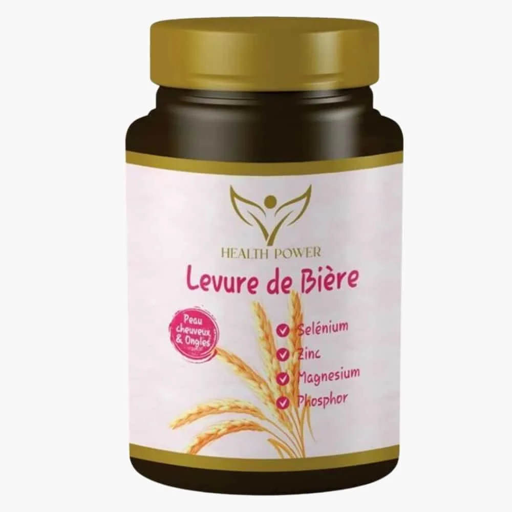HEALTH POWER Levure de Bière est un complément alimentaire naturel à base de levure sèche, connue pour sa richesse en vitamines B, acides aminés et minéraux. Elle stimule la croissance des cheveux, améliore leur brillance, renforce les ongles et contribue à une peau plus nette. Convient particulièrement en cas de chute de cheveux saisonnière, ongles cassants ou peau fatiguée. Cure recommandée sur 2 à 3 mois. Produit naturel, sans colorants ni conservateurs. Disponible à Casablanca, livrable dans tout le Maroc avec retrait possible en parapharmacie.
