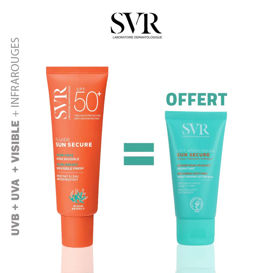 SVR Sun Secure SPF 50+ est une crème solaire haute protection conçue pour protéger la peau des rayons UVA, UVB, lumière visible et infrarouge. Sa texture fluide et légère s’étale facilement et laisse un fini invisible, non gras et sans traces blanches.